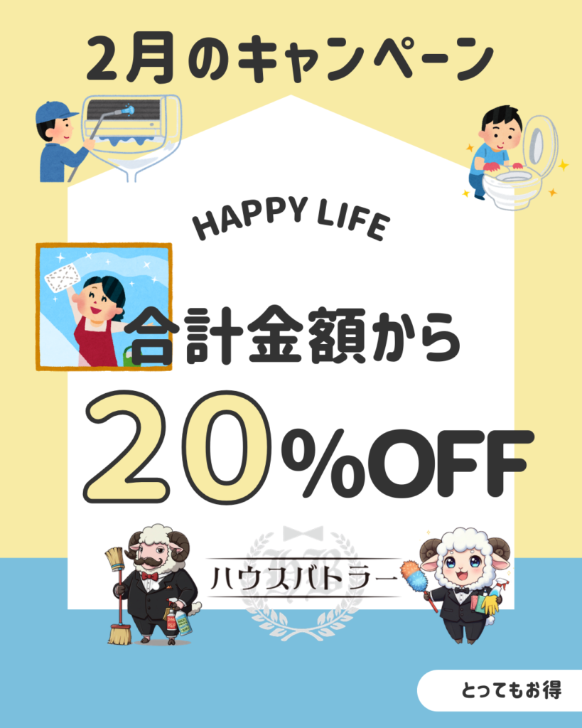 お知らせ 2月のキャンペーン 2026.02.13 さいたま市浦和区を中心に10年以上の実績を持つハウスクリーニング専門店。職人歴3年以上のエキスパートのみが丁寧に対応。エアコン・水回り清掃もお任せください。埼玉県全域対応(他エリア要相談)。2月限定20%OFF実施中。 お知らせ一覧に戻る
